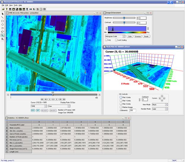After data is collected, the digital infrared imagery is processed into a series of ortho-rectified image tiles, which are then stitched together to create a giant mosaic image. A computer system puts all this information together using a digital elevation model (DEM) of the scene that consists of a uniform grid of point elevation values and the position and orientation of the camera with respect to a three-dimensional coordinate system output. The result is presented as a high-resolution thermal image in the form of a geo-TIFF (see Figure 5), which is compatible with any GIS software such as ESRI ArcView™, AutoCAD® Map 3D, Global Mapper, MapInfo™, etc. Once high quality digital thermal and photographic ortho-rectified maps are created, they can be added as layers other data sets, to existing or new CAD and GIS systems. Digital data can also be post-processed in other ways, such as creating false color imagery to highlight areas of interest, adding temperature data and/or creating graphic reports (see Figure 6).